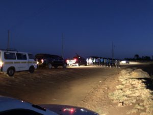 まだ暗い中、車のライトに照らされながらウォーミングアップ開始。