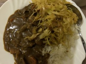 夕食は、いつものビーフシチューにとろみをつけてカレーに。これが美味しすぎて、大盛りを2杯食べてお腹いっぱい。